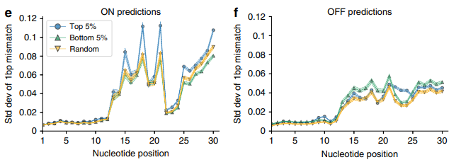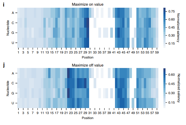 为了了解支点序列中的变化如何影响模型预测,作者对2500个随机实验支点进行了诱变扫描。对于支点中的每个位置处的所有四个可能碱基对进行了突变,并计算了基于CNN模型的ON(图2e)和OFF(图2f)预测的标准偏差。在位置15、18和21处,效应大小的峰值反映了序列标志中的重要位置,表明该模型了解了核苷酸的位置重要性。同时,在每个位置用随机核苷酸对500个随机选择支点进行序列突变,然后反馈到LM中以计算分类概率(图2g),与先前的突变分析相呼应,位置26–30被证明对支点表现有最大的影响。为了确定模型的决策过程并进一步确定支点序列中的重要区域,作者首先对一组5000个随机取样的支点(图2h)计算了语言模型的自注意力。自注意图表明转换区的最后12个核苷酸,对分类决策影响最大。这些结果反映在由CNN模型计算的显着性图上,作者在其中评估了100个随机序列中每个位置对最大化ON值(图2i)和最小化OFF值(图2j)的重要性。在这里,通过对每个位置的核苷酸之间的梯度求和来计算出较高的显著性,表明该核苷酸在模型的ON或OFF预测过程中被认为更具影响力。为了了解序列显着性是否随ON或OFF预测的实验值变化,评估了高表现和低表现支点定点集的显著性图。表现不佳的支点位图在前12个核苷酸中表现出的活化程度与它们的高性能对应物相似,表明该模型学习了支点不同区域与预测功能之间的关系。