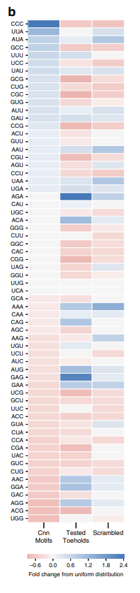 作者和Angenent-Mari共同设计了包含244,000个支点开关的数据集,包括病毒和人类基因组序列以及随机序列,其中91,534个开关在实验表征后符合定义明确的质量控制标准。如图c,d,作者进行了传统的生物信息学表达研究,发现高性能和低性能序列中,核苷酸组成不同。标志为了进一步了解序列编码部分的变化如何影响支点表现,作者对读框内氨基酸进行了更广泛的分析,读框内终止密码子在高性能序列的N末端发生的频率较低,较小的疏水性氨基酸(例如缬氨酸,丙氨酸和甘氨酸)在高性能序列的N端比在低效氨基酸序列中更常见。为了阐明良好支点和不良支点之间的任何宏观序列模式,作者利用CGR提供了一种信息丰富且无损的编码方案,并观察到表现良好的A富密码子的富集。