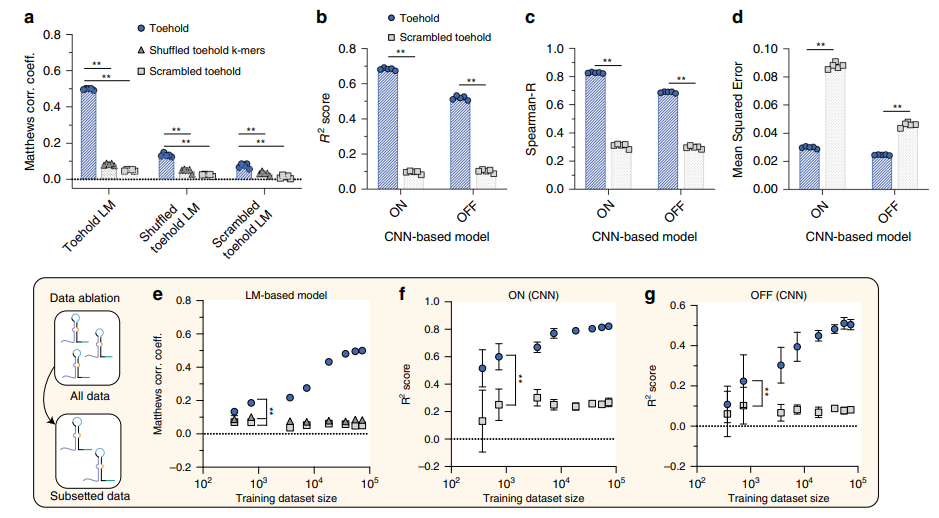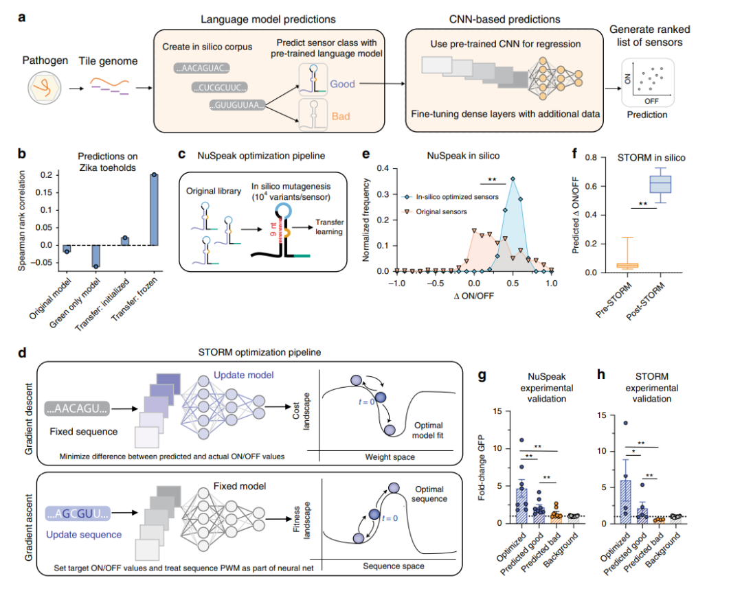 为了说明方法价值,并在概念验证演示中解决对传感器的迫切需求,这些传感器可以基于病原体基因组RNA快速检测正在出现的传染病,作者基于在SARSCoV-2基因组中的独特性和与其他已知人类呼吸道疾病的正交性,确定了四个感兴趣的区域,通过LM模型和基于CNN的模型共同选择了支点序列,并通过实验评估了预测结果。对于共同模型和单独的转移学习CNN(图4g,h),作者发现“预测好的”和“预测不好的”传感器之间存在显着分离,这与模型结果一致。