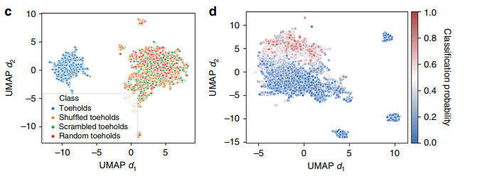同样,作者还构建了一种编码器/解码器体系结构来学习支点序列语言,其中每个k-mer被视为“单词”或“令牌”,每个支点序列是一个“句子”。编码器为输入语料库中每个唯一标记,学习有意义的,与上下文相关的表示形式,然后可以使用线性分类层进行扩展,以预测给定支点的好坏。当将表示向量映射回解码器扩充时,完整的LM可以在语言空间内生成任意长度的有意义序列。作者首先在计算机生成的400万个合成支点上训练了LM。为了确定LM是否已学会了支点序列的有意义表示,作者将一个支点序列的400维表示映射到具有UMAP41的降维流形上(图2c),并将其与加扰和混洗方法进行比较。作者表示,真正的支点序列和二维流形上的控件之间没有重叠,这表明LM捕获了一个支点序列中基序顺序的重要性。此外,作者使用其他支点数据集来训练序列分类器。图2d显示,分类器将表现良好的支点和劣质支点分为两类,分类概率接近0.5的序列会填充决策边界,预测性分别比使用混洗和加扰的支点分类器高约3.7倍和约6.2倍,说明了序列基序顺序对于区分支点性能至关重要,模型已学会了除了k-mer频率以外的更多信息。