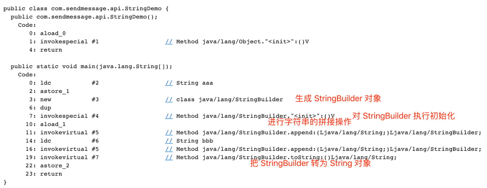 public com.sendmessage.api.StringDemo(); Code: 0: aload_0 1: invokespecial #1 // 执行对象的初始化方法 4: return public static void main(java.lang.String[]); Code: 0: ldc #2 // 将 String aaa 执行入栈操作 2: astore_1 # pop出栈引用值,将其(引用)赋值给局部变量表中的变量 s1 3: ldc #3 // String bbbccc 5: astore_2 6: return