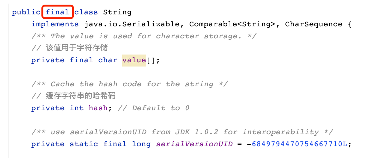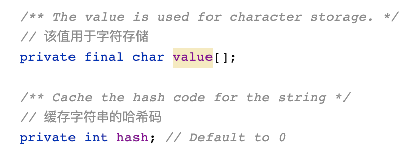 所以,String 中有一个用于存储字符的 char 数组 value[],这个数组存储了每个字符。另外一个就是 hash 属性,它用于缓存字符串的哈希码。因为 String 经常被用于比较,比如在 HashMap 中。如果每次进行比较都重新计算其 hashcode 的值的话,那无疑是比较麻烦的,而保存一个 hashcode 的缓存无疑能优化这样的操作。