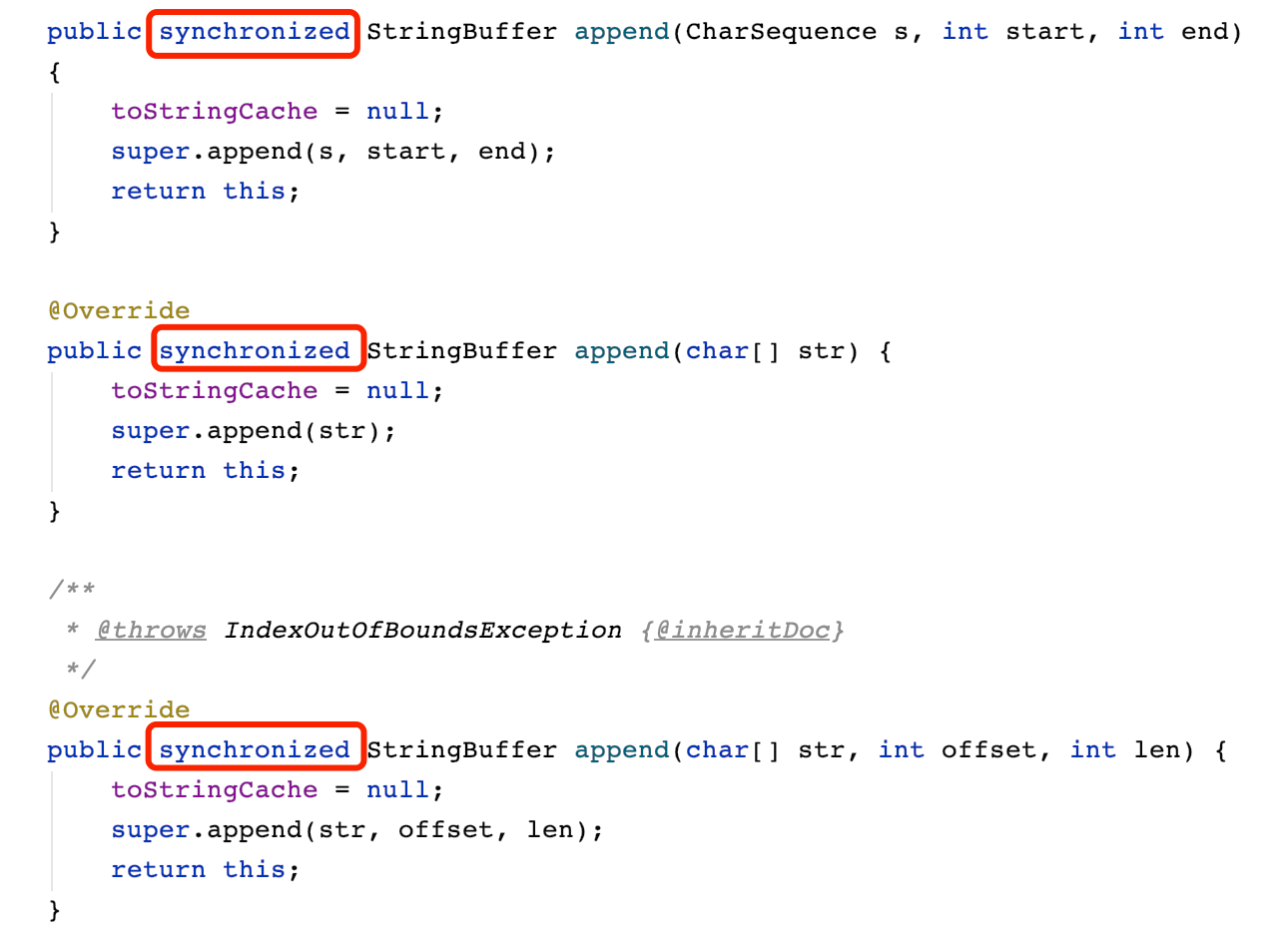 StringBuffer 在字符串拼接上面直接使用 synchronized 关键字加锁,从而保证了线程安全性。