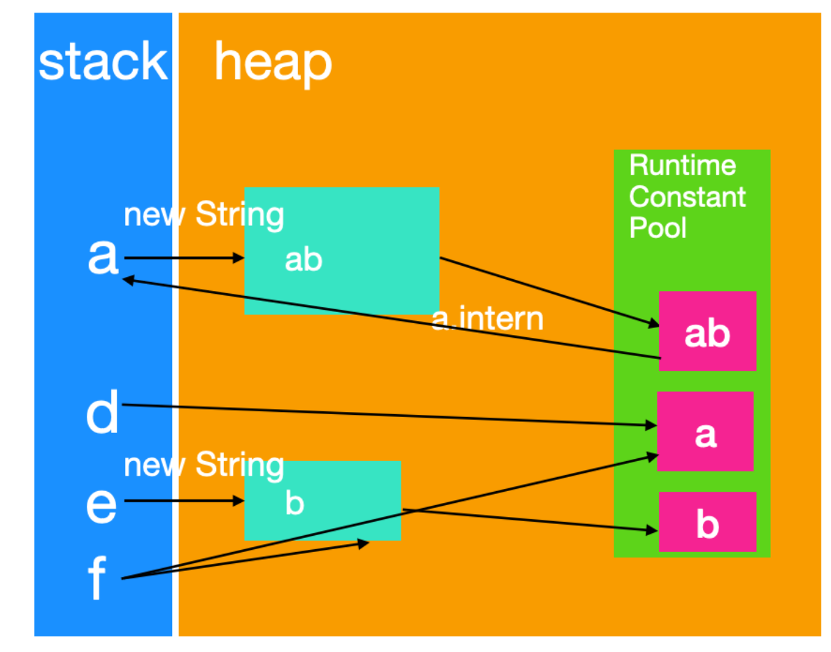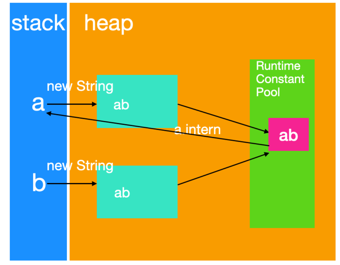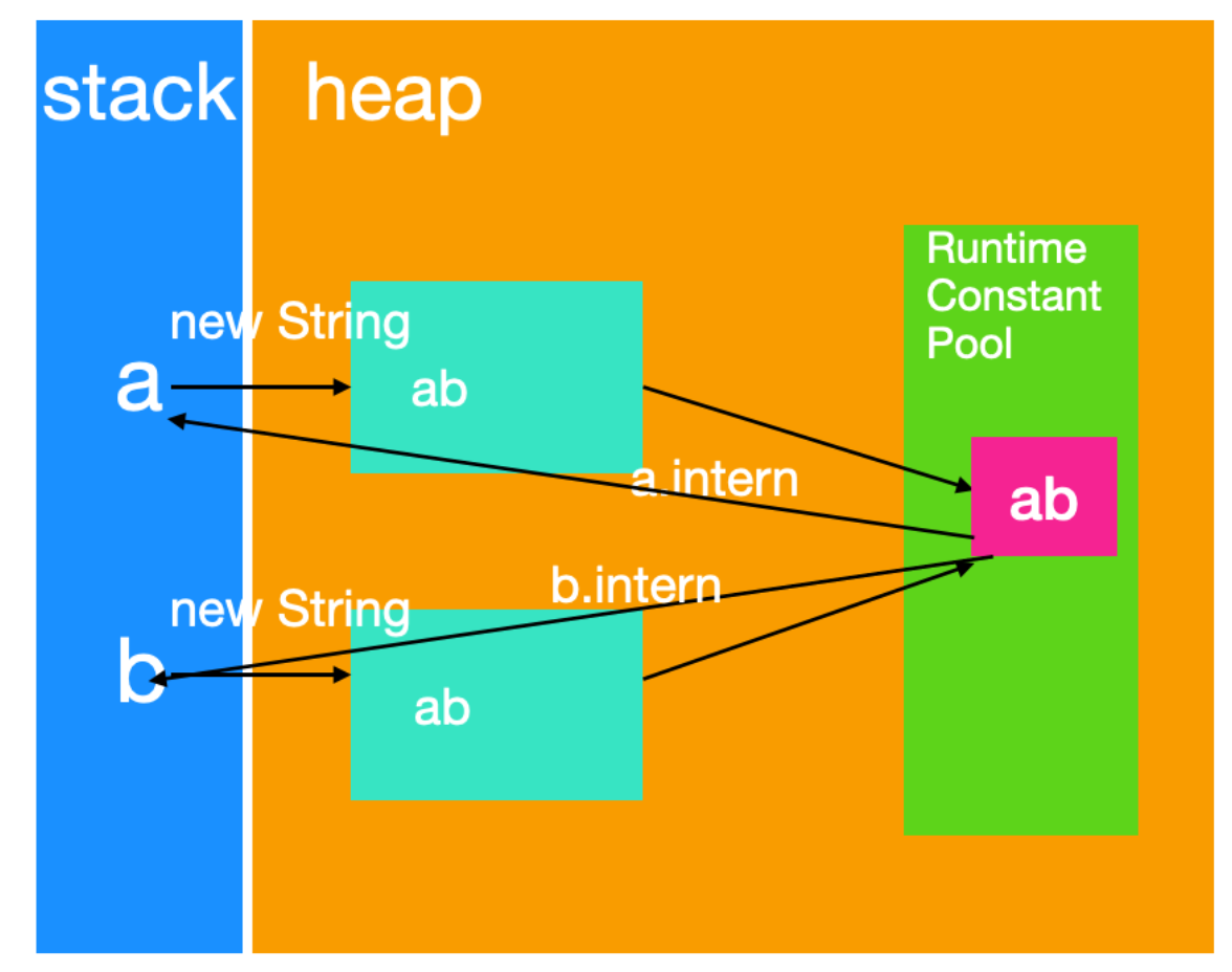 a.intern 返回的是常量池中的 ab,而 b 是直接返回的是堆中的 ab。地址不一样,肯定输出 false