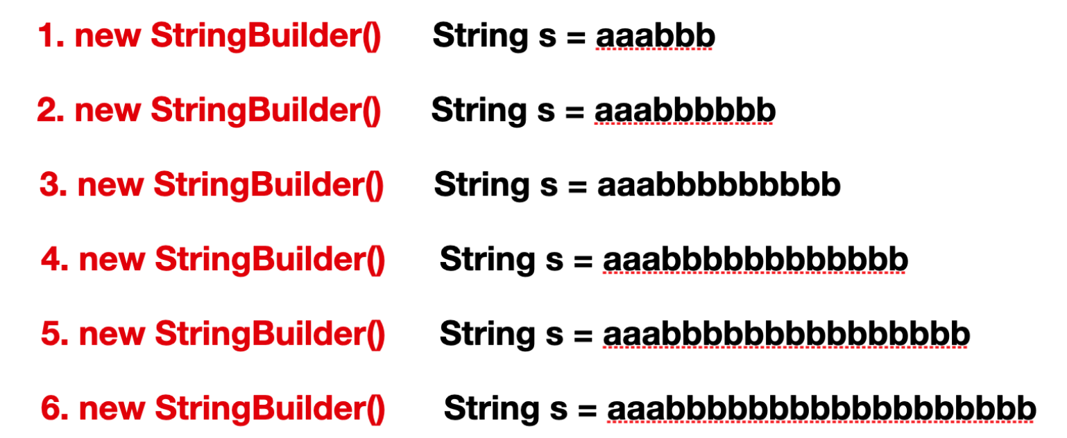 你能看出来需要注意的地方了吗?在每次进行循环时,都会创建一个 StringBuilder 对象,每次都会把一个新的字符串元素 bbb 拼接到 aaa 的后面,所以,执行几次后的结果如下