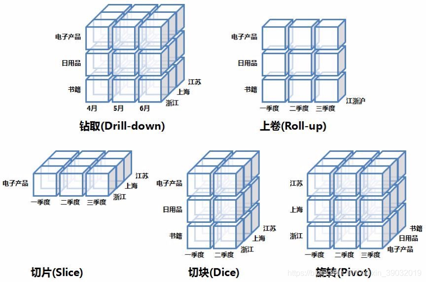 - ★钻取:维的层次变化,从粗粒度到细粒度,汇总数据下钻到明细数据。如通过季度销售数据钻取每个月的销售数据