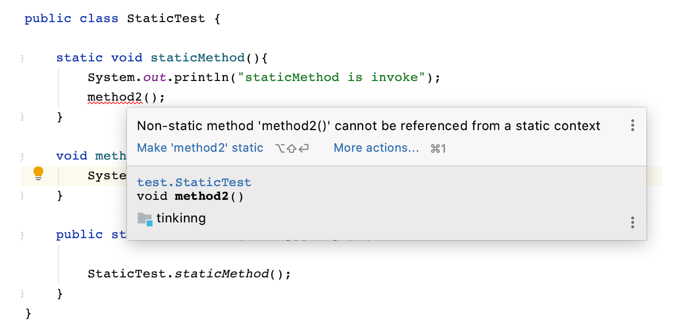 其中有一句非常重要的话就是 static 方法就是没有 this 的方法,也就是说,可以在不用创建对象的前提下就能够访问 static 方法,如何做到呢?看下面一段代码