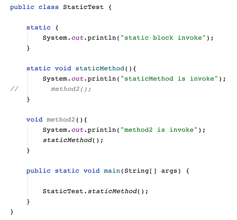 public class StaticTest { public StaticTest(){} public static void test(){ } public static void main(String[] args) { StaticTest.test(); StaticTest staticTest = new StaticTest(); }