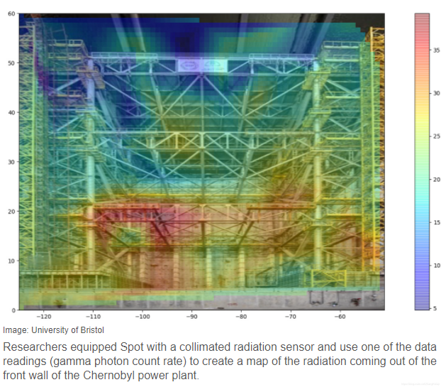 研究人员为Spot配备了准直辐射传感器,并使用数据读数之一(伽马光子计数率)创建了切尔诺贝利电厂前壁发出的辐射图。