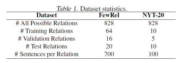 NYT-25:NYT-25的原始数据来自FewRel的官方网站,其中25关系下的标记句子是通过注释纽约时报数据来提供的。数据集没有区分训练、验证和测试集。因此,作者随机抽取10个关系进行训练,5个关系进行验证和剩余10个关系进行测试。
