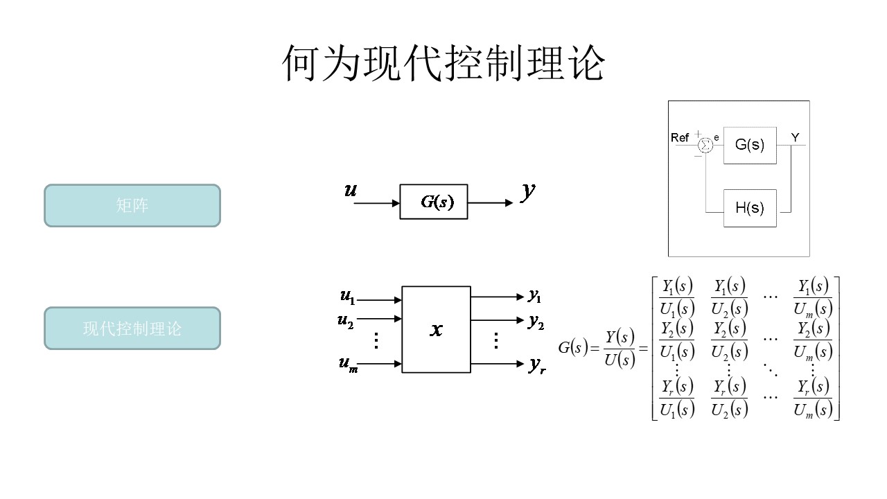 现代控制理论用于多输入多输出系统,更复杂,并可实现最优控制。