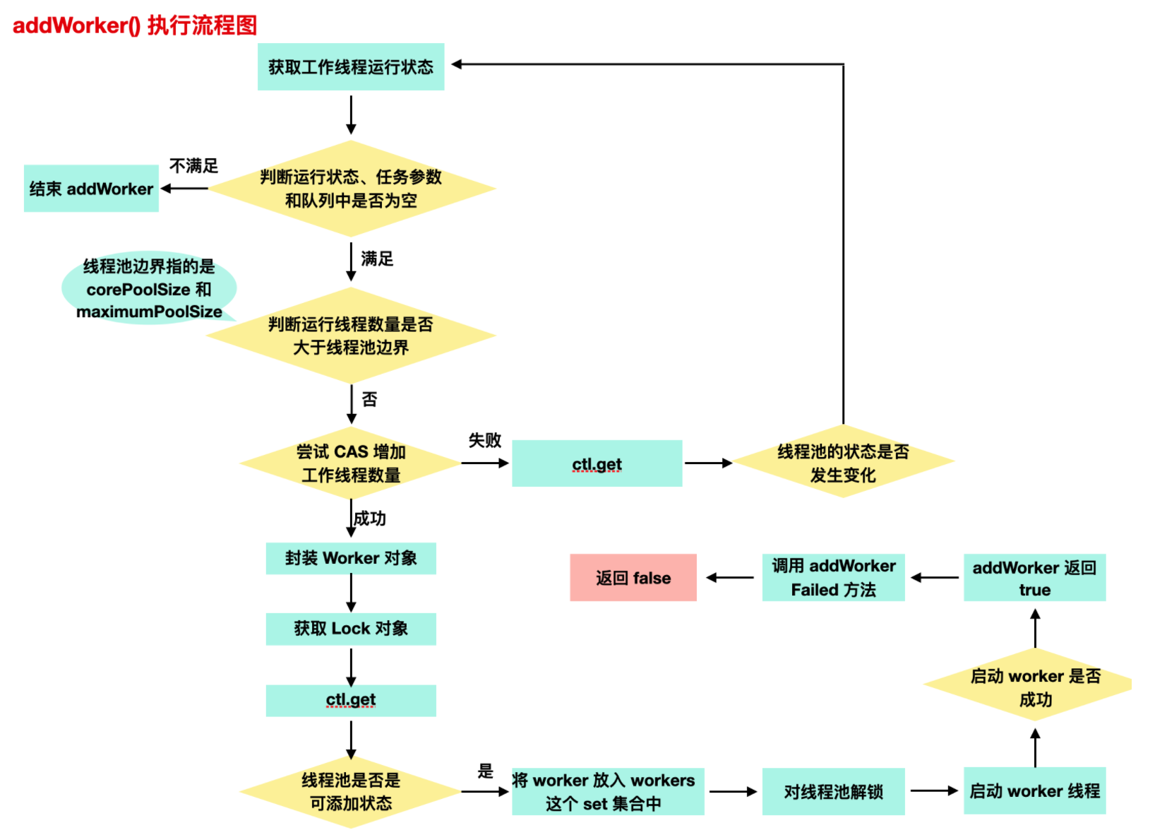 - 如果当前运行的线程数少于 corePoolSize,则会创建新线程 addworker 来执行任务
