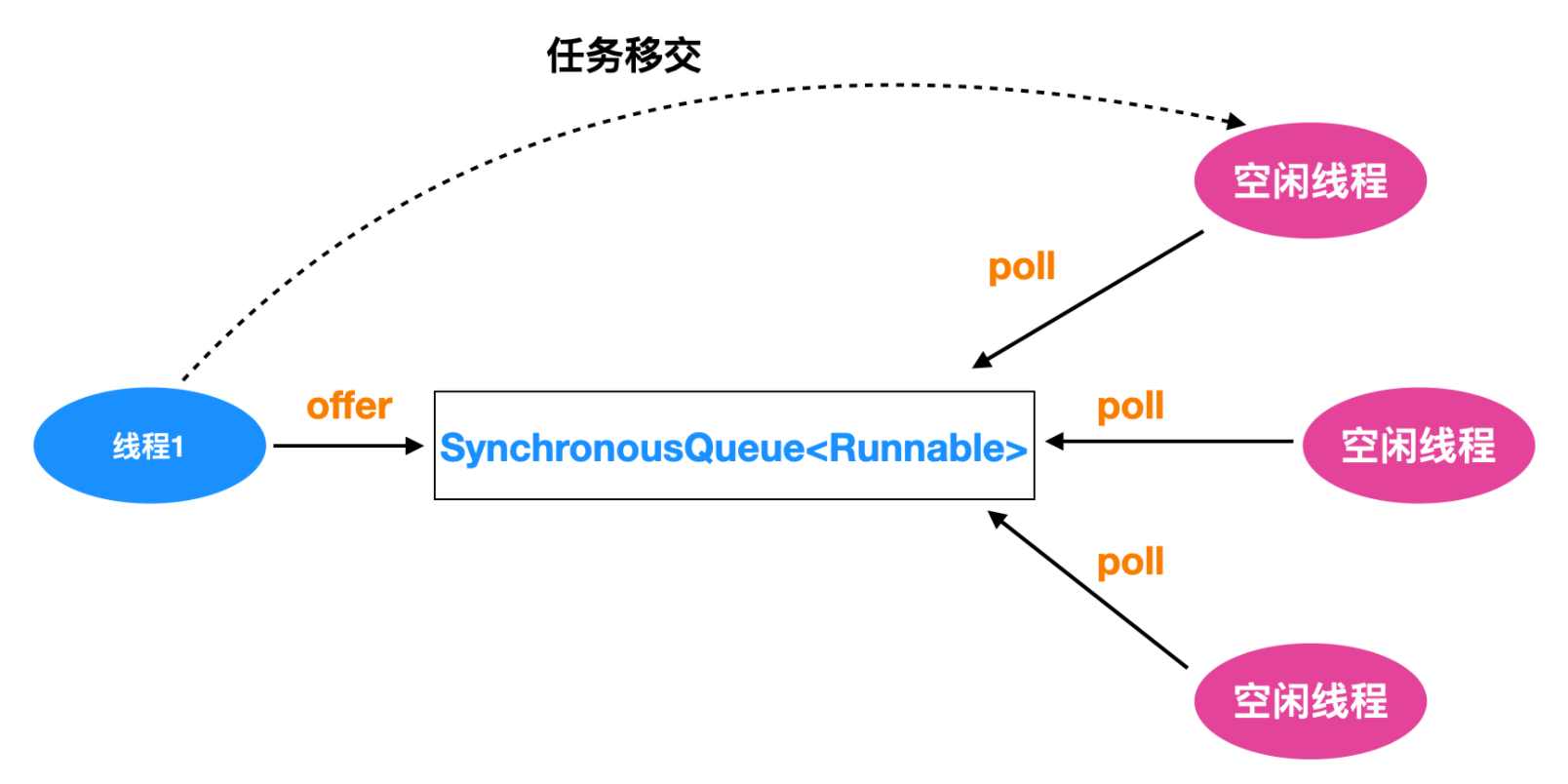 这里的关键点在于 SynchronousQueue 队列,它是一个没有容量的阻塞队列。每个插入操作必须等待另一个线程对应的移除操作。这其实就是一种任务传递,如下图所示