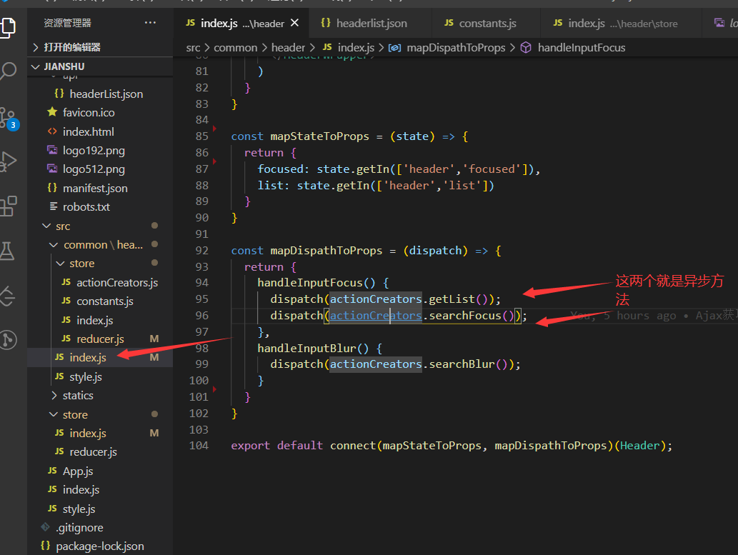比如,当我聚焦的时候,推荐组件需要出现,搜索框需要拉长。这里涉及了两种函数,需要使用redux-thunk异步。