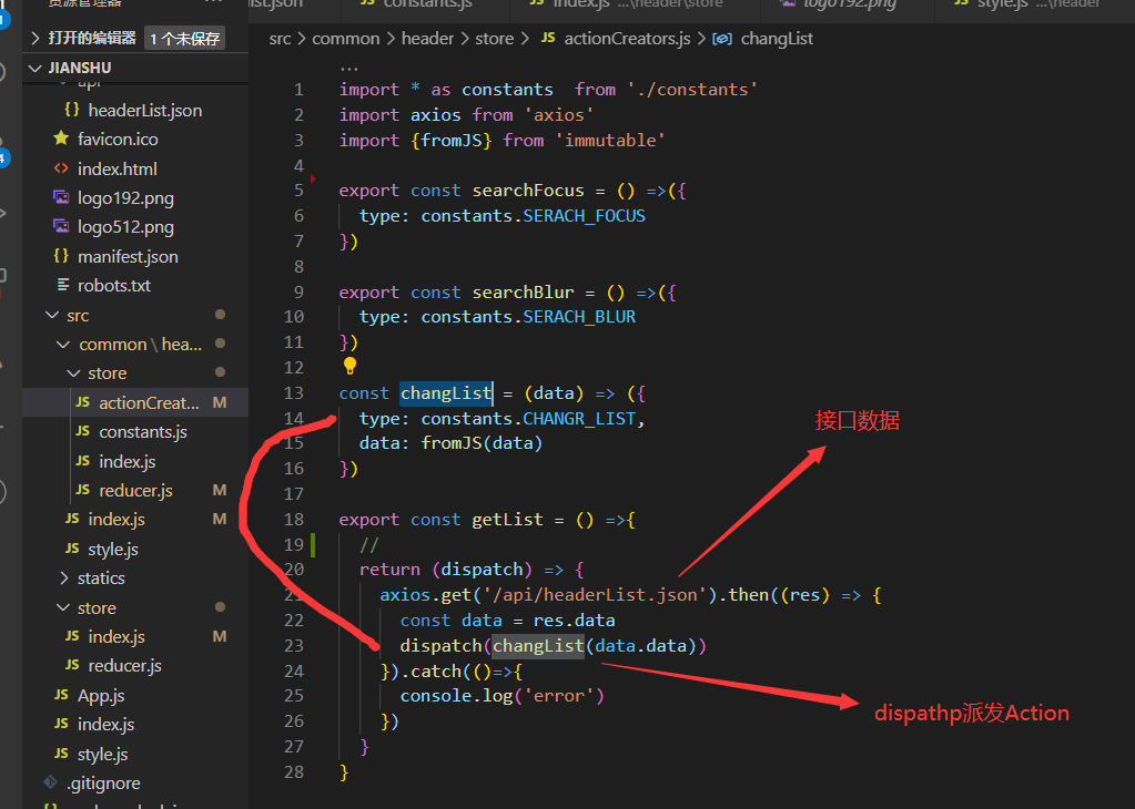 return (dispatch) => { axios.get('/api/headerList.json').then((res) => { const data = res.data dispatch(changList(data.data)) }).catch(()=>{ console.log('error') })