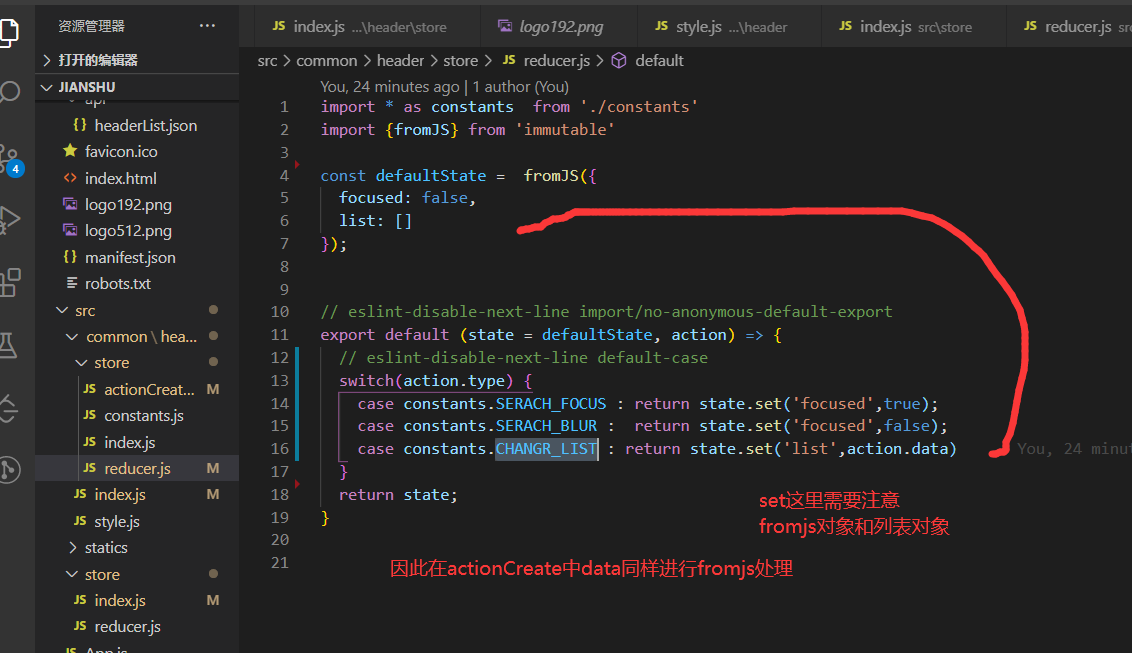 switch(action.type) { case constants.SERACH_FOCUS : return state.set('focused',true); case constants.SERACH_BLUR : return state.set('focused',false); case constants.CHANGR_LIST : return state.set('list',action.data)
