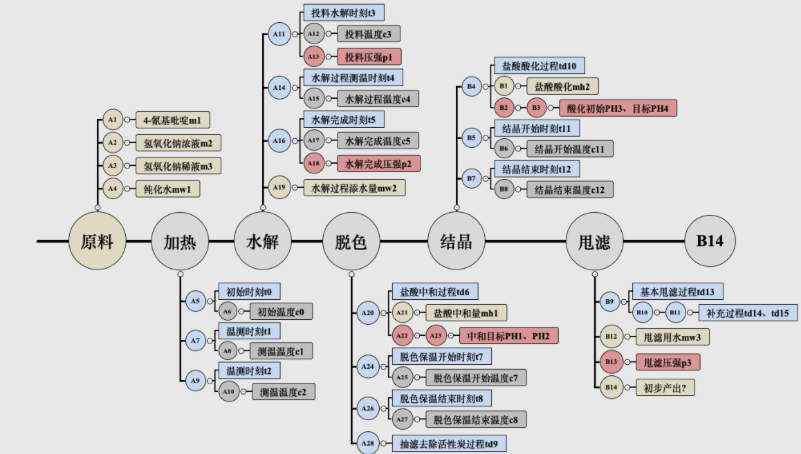 - 数据集包括生产工程中10个步骤的参数,样本id、A1-A28、B1-B14包括原料、辅料、时间、温度、压强等以及收率