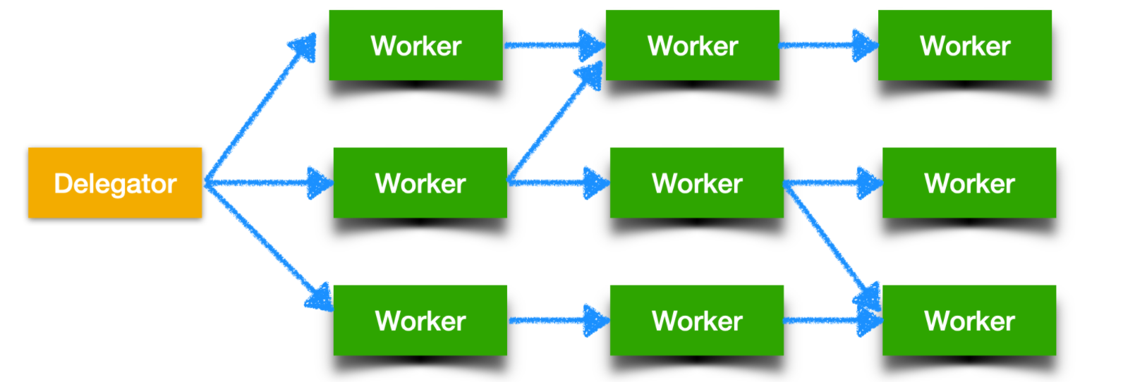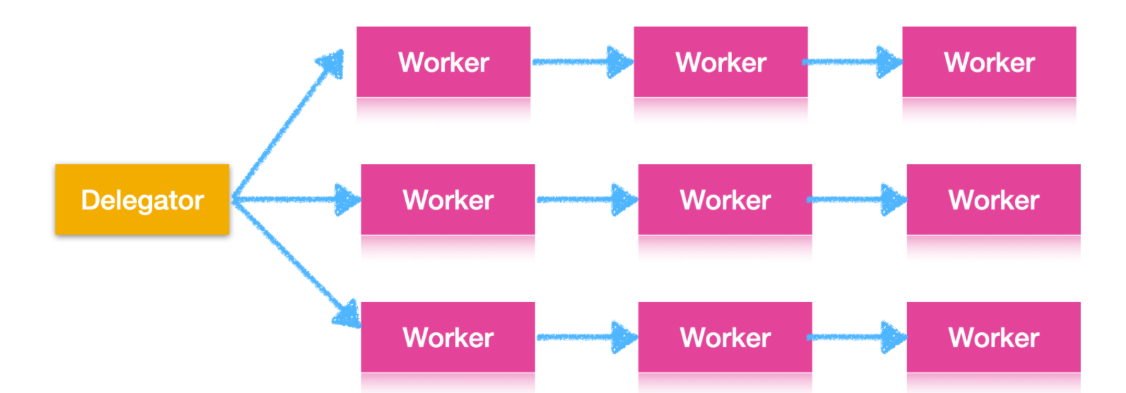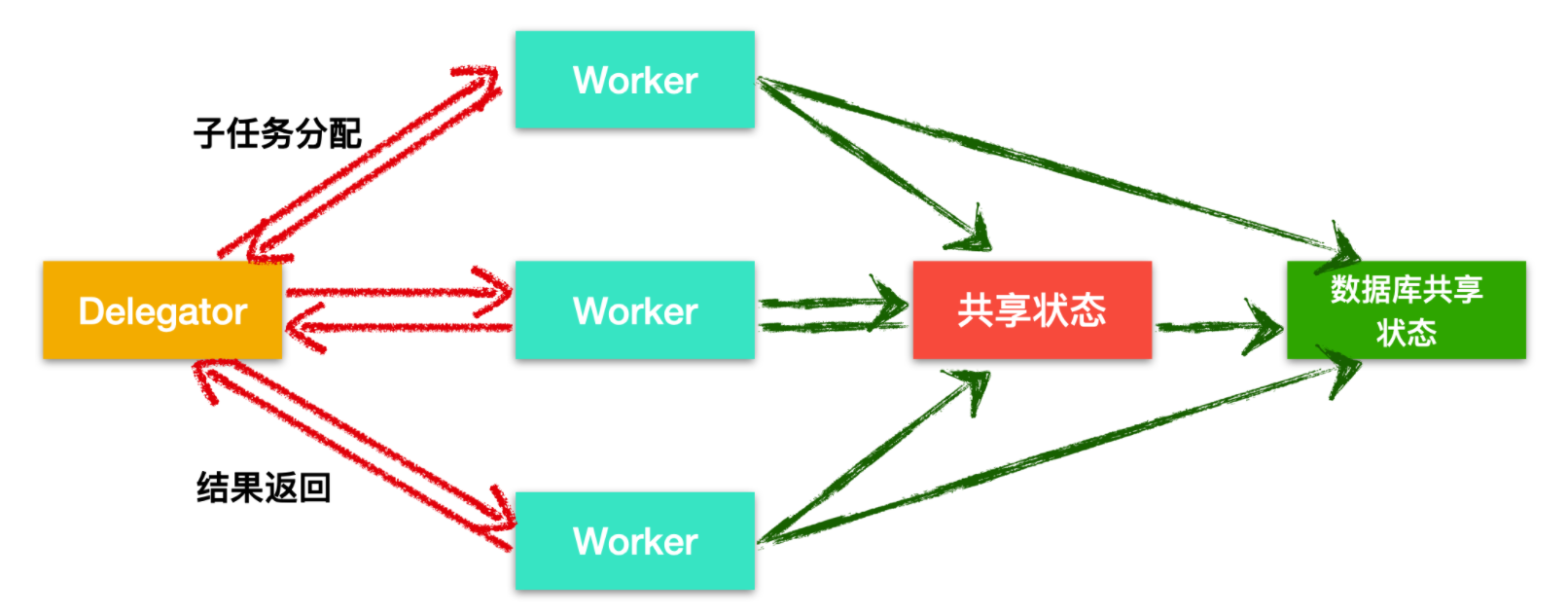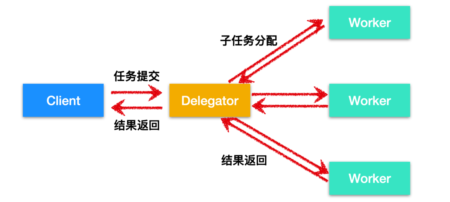 并行 worker 的核心思想是,它主要有两个进程即代理人和工人,Delegator 负责接收来自客户端的任务并把任务下发,交给具体的 Worker 进行处理,Worker 处理完成后把结果返回给 Delegator,在 Delegator 接收到 Worker 处理的结果后对其进行汇总,然后交给客户端。