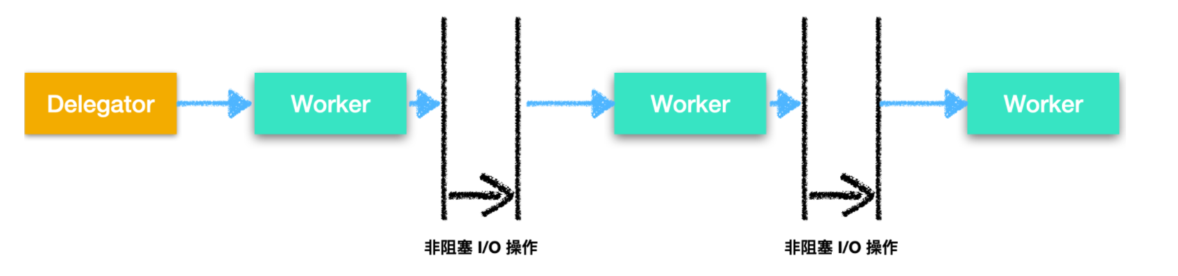 使用流水线并发模型通常被设计为非阻塞I/O,也就是说,当没有给 worker 分配任务时,worker 会做其他工作。非阻塞I/O 意味着当 worker 开始 I/O 操作,例如从网络中读取文件,worker 不会等待 I/O 调用完成。因为 I/O 操作很慢,所以等待 I/O 非常耗费时间。在等待 I/O 的同时,CPU 可以做其他事情,I/O 操作完成后的结果将传递给下一个 worker。下面是非阻塞 I/O 的流程图