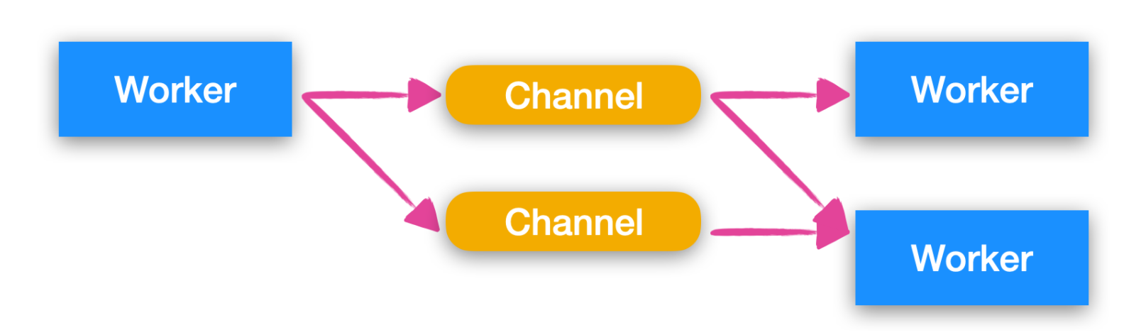 有的时候 worker 不需要明确知道接下来的 worker 是谁,他们只需要将作者写入通道中,监听 Channel 的 worker 可以订阅或者取消订阅,这种方式降低了 worker 和 worker 之间的耦合性。