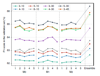 在架构搜索过程中,为了提高计算效率,对模型进行了小范围的训练,并且可以对模型进行增强以获得更好的性能。尽管由于内存溢出,未能对M2-5模型进行超参数集的训练,但由于模型深度和通道数的增加,所有所选模型的性能都得到了改善,如图3所示。