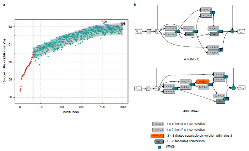 本文修改了原先的AmoebaNet从而用于残基Contact Map预测,包括引入了I/R/CN操作。使用改进的算法,我们总共探索了500个网络架构,其中前64个架构是随机生成的,后续的模型是从随机架构中进化得来的。图2a显示了验证集上500个架构的f1分数。在架构搜索结束时,模型性能收敛到~62%,最佳模型达到62.16%。所选模型的详细架构如图2b所示。