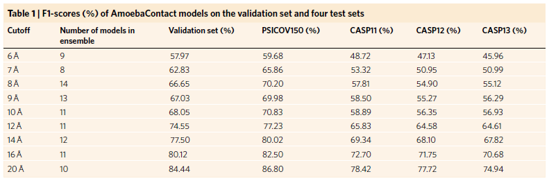 AmoebaContact在验证集和PSICOV150测试集之间表现出相差无几的性能,但是在三个CASP测试集中显示出较低的f1分数,如表1所示。这是意料之中的,因为CASP目标通常是更加困难的,仅包含具有同源序列的多序列比对(MSA)信息。