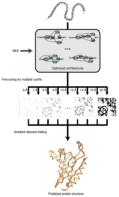 本文使用AmoebaNet来优化网络架构,用于蛋白质Contact Map预测,并在其中加入了行标准化和列标准化;加入了类似ResNet的短路式连接,以防学习饱和;允许模型权值继承来加速训练。如图1所示,AmoebaContact可以产生多个输出,提供了残基对之间的更全面的距离信息,用于更加有效和准确的结构建模。而基于梯度下降的折叠算法GDFold可以通过最小化可微损失函数来进行优化。