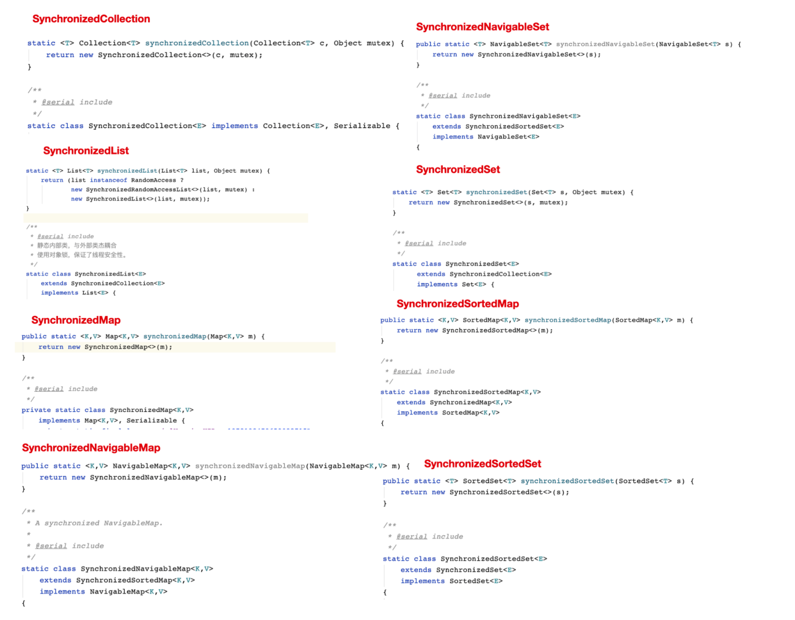 我们可以通过 Collections 源码可以看出这些线程安全的实现