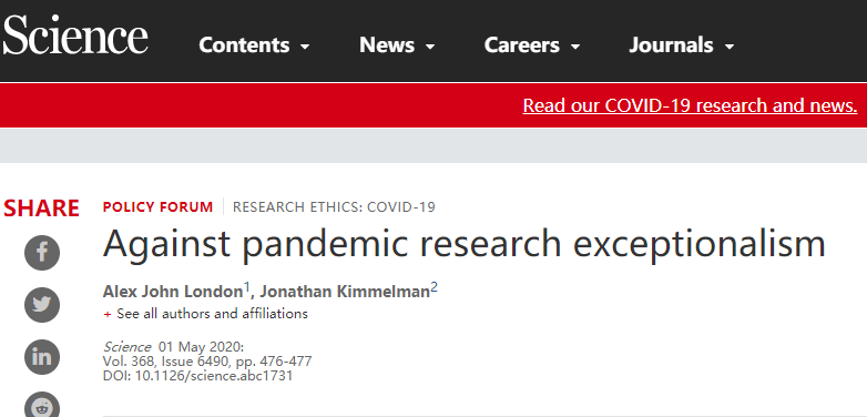 Against pandemic research exceptionalism. Alex John London, Jonathan Kimmelman. Science 01 May 2020:Vol. 368, Issue 6490, pp. 476-477