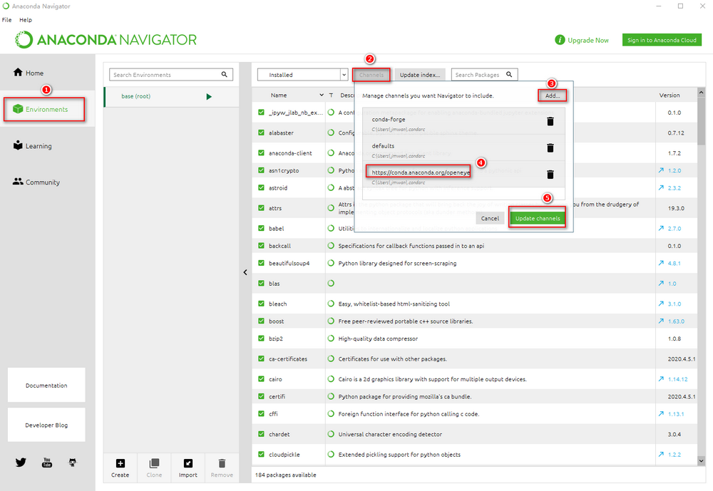 环境完成初始化后,点击“channels”,将弹出一个对话框。 点击“Add”,然后 添加OpenEye channels中输入https://conda.anaconda.org/openeye后 回车。 然后点击“Update channels”。