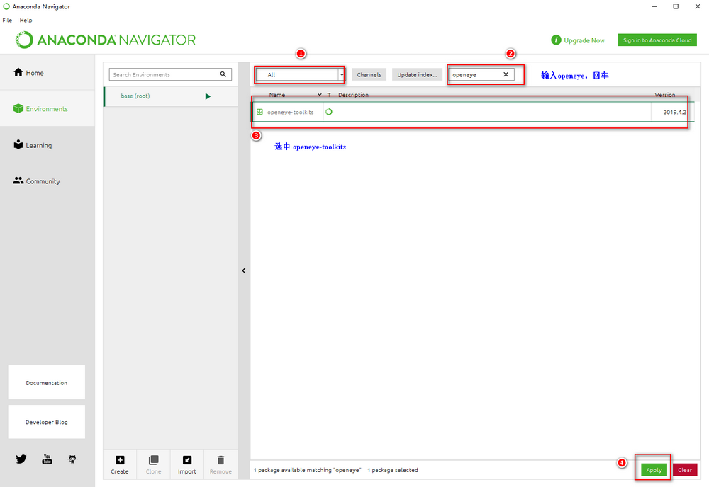 选中‘Not installed’ or ‘All’ ,在 ‘Search packages’ 窗口输入openeye回车;