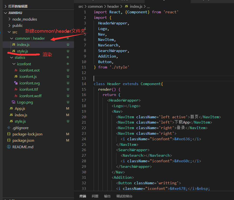 render() { return ( <HeaderWrapper> <Logo></Logo> <Nav> <NavItem className='left active'>首页</NavItem> <NavItem className='left'>下载App</NavItem> <NavItem className='right'>登录</NavItem> <NavItem className='right'> <i className="iconfont"></i> </NavItem> <SearchWrapper> <NavSearch></NavSearch> <i className="iconfont"></i> </SearchWrapper> </Nav> <Addition> <Button className='writting'> <i className="iconfont"></i> 写文章</Button> <Button className='reg'>注册</Button> </Addition> </HeaderWrapper> )