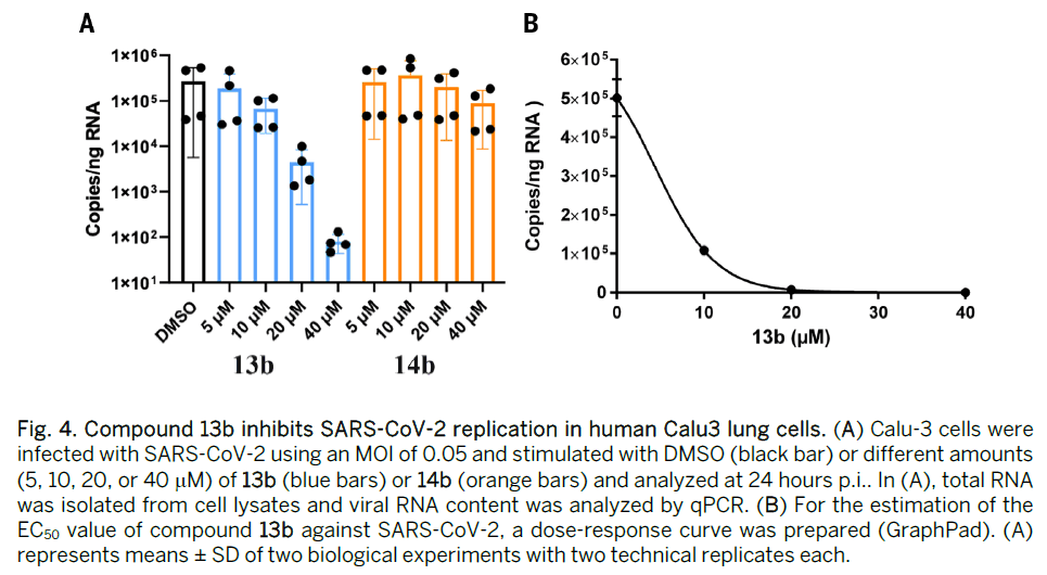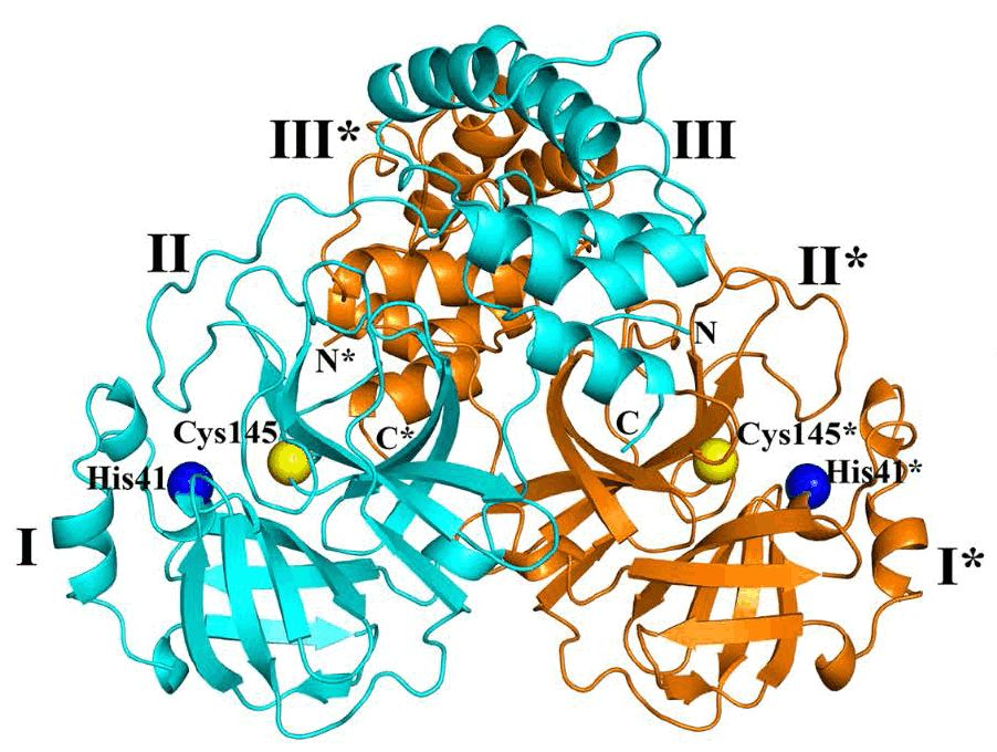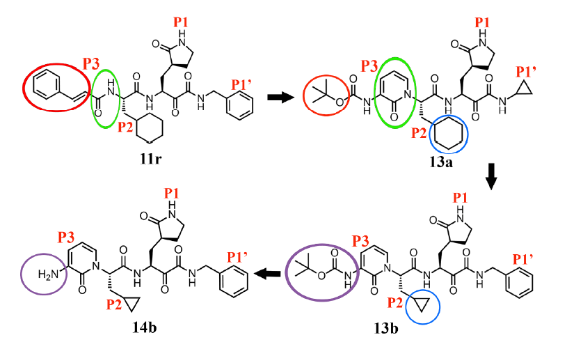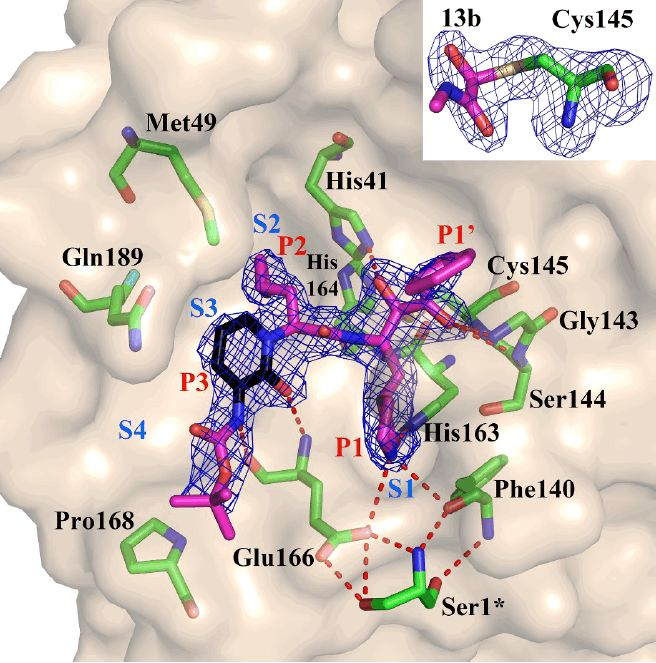 在研究主要蛋白酶的结构的基础上,研究人员优化了现有冠状病毒的抑制剂,以开发化合物13b,后者是SARS-CoV-2主要蛋白酶的有效阻断剂。他们使用不含配体的SARS-CoV-2的X射线结构,研究了其与源自先前设计的化合物的α-酮酰胺抑制剂的复合物,其P3-P2酰胺键并入了吡啶酮环中以增强半衰期。