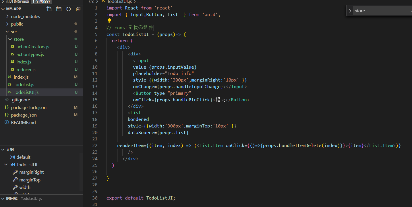 return ( <div> <div> <Input value={props.inputValue} placeholder="Todo info" style={{width:'300px',marginRight:'10px' }} onChange={props.handleInputChange}></Input> <Button type="primary" onClick={props.handleBtnClick}>提交</Button> </div> <List bordered style={{width:'300px',marginTop:'10px' }} dataSource={props.list} renderItem={(item, index) => (<List.Item onClick={()=>{props.handleItemDelete(index)}}>{item}</List.Item>)} /> </div>