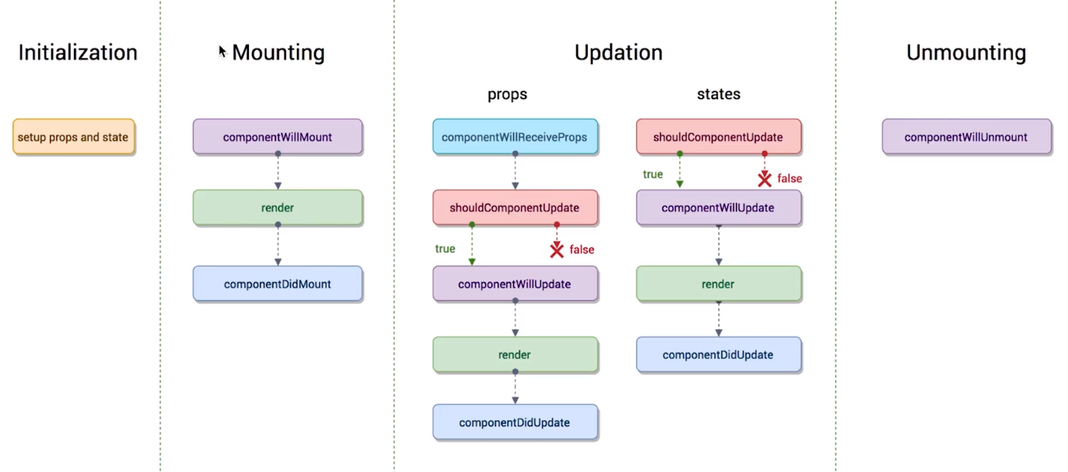 - shouldComponentUpdate(nextProps, nextState) 组件接收到新的props或者state时调用,return true就会更新dom(使用diff算法更新),return false能阻止更新(不调用render)