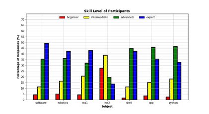 首先,我们要求调查的参与者做的第一件事是自我报告他们在各种ROS相关的主题上的技能水平,如C++、Python、Shell脚本、机器人等。你可以看到下面这个情节。