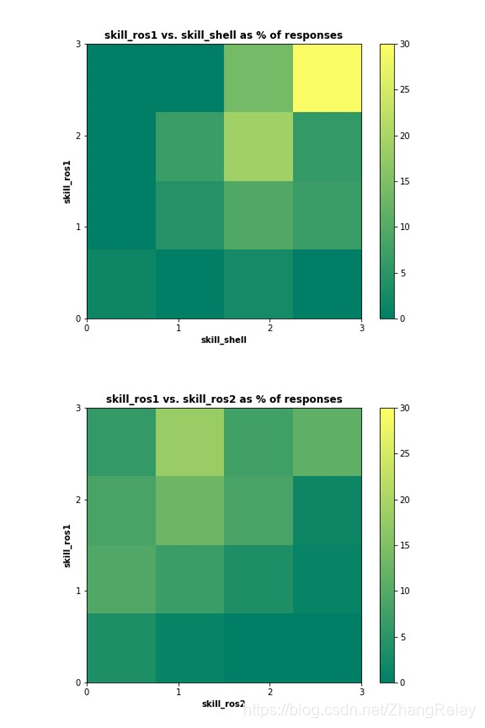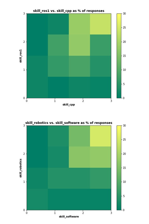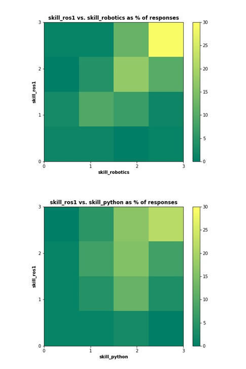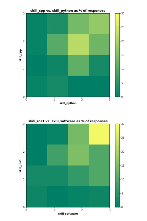 在发布之前,我联系了Steve Macenski,让他对这部作品进行回顾。他说,他和其他人都有一个问题,那就是如何在C++和Python之间适当地分配时间和资源。他很好奇社区中是否存在偏向于其中一个或另一个的问题。既然我们已经准备好了所有的数据,那么绘制结果就很简单了。我为两个技能创建了一个自我报告的技能矩阵,然后将其归一化为受访者的总人数。我并没有看所有的变化,因为我认为这并没有什么价值,但我看了一些最相关的数据。
