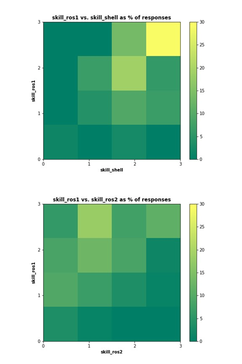 看这几张图的方式是左下是两方面都不太熟练的,而右上是两方面都很熟练的。用颜色表示受访者的数量。在这些图中,大多数跳出来的第一感觉就是样本偏向,也就是说右上角几乎都是最亮的方块。至于C++和Python的问题,答案似乎是大多数回答者在这两个方面的技能大致相当。这个模式在我所看到的大多数其他技能比较中都是如此。另一种方法来解释这个数据是说,也许精通ROS 1需要掌握,或者至少需要精通C++、Python、shell脚本、机器人和软件工程基础知识。