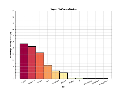 我们收集到的数据显示,移动机器人和自主车辆占到了社区兴趣的近50%,工业应用也在其中。虽然无人机和水面车辆很重要,但它们只占社区中的一小部分。同样的,像医疗机器人、农业机器人等特定的应用领域仍然是小众领域。