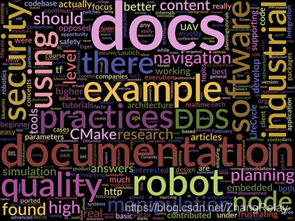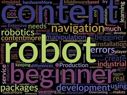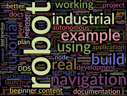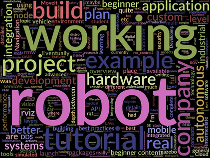 调查中还包含两个问题,我们问了社区用户在使用ROS的情况,以及他们打算使用ROS做什么。不幸的是,我们决定将这些数据保留下来,这样用户就可以放心地谈论他们的绝密计划。为了查看这些数据,我首先将这两个数据集进行了串联,并剔除了100个最常见的英文单词,以及其他一些经常出现的词汇(比如ROS、ROS 2、Gazebo等)。从这些数据中,我去生成了一个词云。