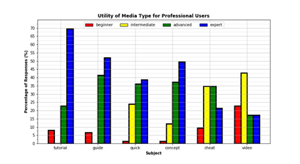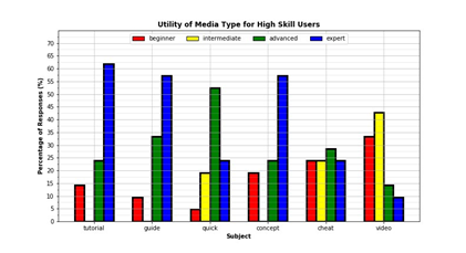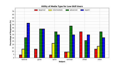 - 熟练度较低的用户比中高技能的用户更喜欢视频,但它们的作用还不如教程。