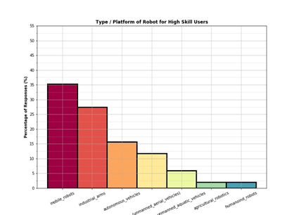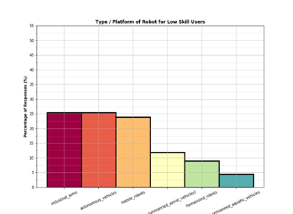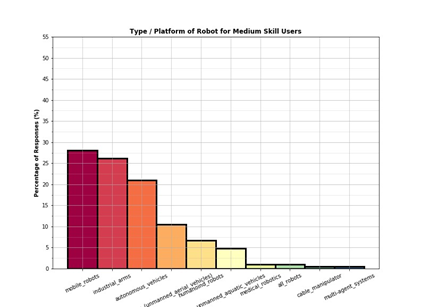 我们想了解的一件事是,人们在使用ROS时对哪些机器人平台感兴趣。我们知道,总的来说,社区的大部分用户对自主移动机器人感兴趣,但我们不确定用户之间是否一致。我们很好奇,不同的技术水平的用户是否表现出对某一平台的偏好。