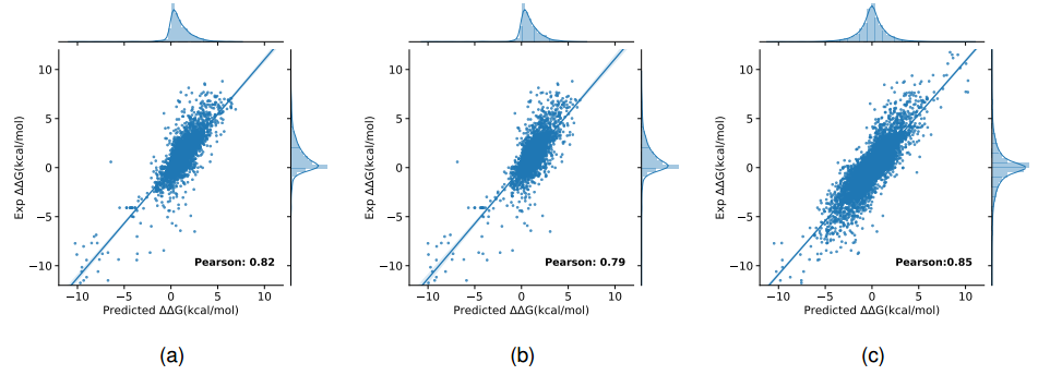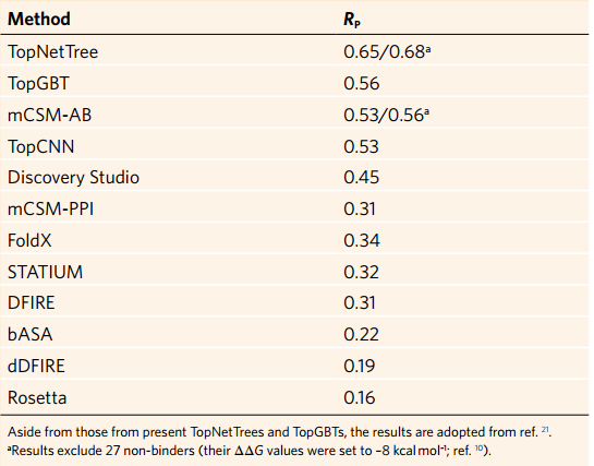 作者将TopNetTree模型应用于集S4947,S4169和S8338三个变体数据集。作者使用十折交叉验证测试了S4947集,实现了平均Rp为0.82和1.11 kcal mol-1的RMSE. 作者遵循在mCSM-PPI2一文中对S4169和S833848集使用的十折分层交叉验证方法。对于S4169组,本模型获得了0.79的平均Rp和1.13 kcal mol-1的RMSE。最后,对于S8338组,本文的方法获得的平均Rp为0.85和1.11 kcal mol-1的RMSE。