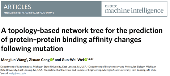 Wang M, Cang Z, Wei G W. A topology-based network tree for the prediction of protein–protein binding affinity changes following mutation[J]. Nature Machine Intelligence, 2020, 2(2): 116-123.