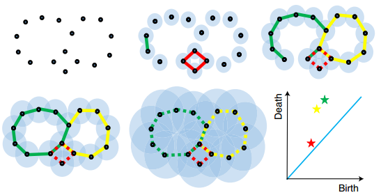 图3. 过滤和持久性。平面上一组点的过滤和H1持续图的说明。