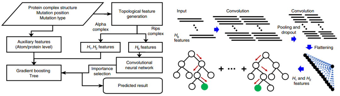 预测PPIs突变后的结合亲和力变化的一个主要挑战是,由于3D结构,数据高度复杂,而数据集相对较小。作者设计了一个混合的机器学习算法,它结合了CNN和GBT来克服这个困难。通过CNN模块将三维结构的拓扑简化描述转化为简洁的特征;在此基础上,建立了具有过拟合控制能力的稳健预测模型。