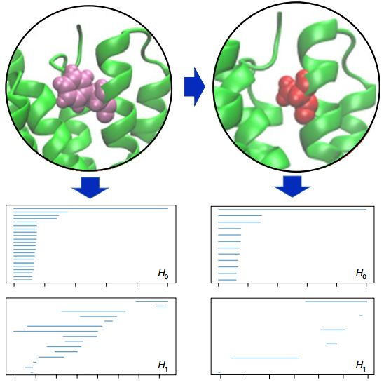 图2. 与突变相关的拓扑条码变化。野生型中的亮氨酸残基突变为丙氨酸。在突变残基的12埃截止范围内产生碳原子的条形码。