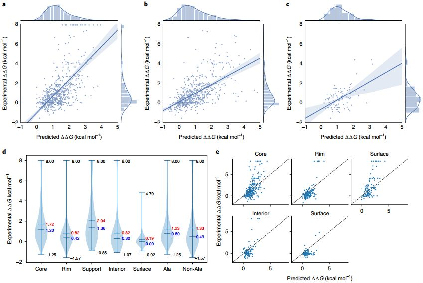 图4. TopNetTree模型的数据和结果. a, 在AB-Bind S645数据集上的十折交叉结果。b, 在AB-Bind S645数据集上出去27个非结合位点的十折交叉结果。c, 与同源结构相关的AB-Bind子集的盲预测。d, 结合亲和度随AB-Bind数据集突变而变化的分布,这些数据集按残基区域类型和丙氨酸突变分组。e, 不同残差区域类型的预测结果。