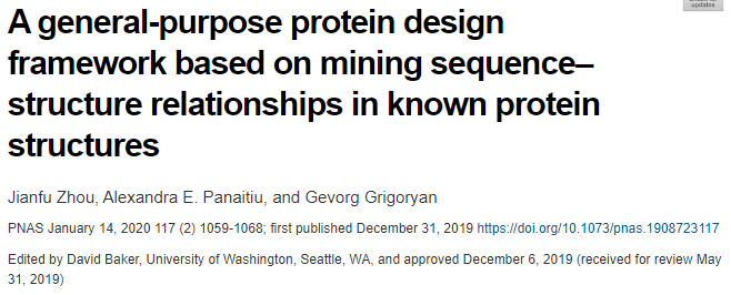 Zhou J, Panaitiu A E, Grigoryan G. A general-purpose protein design framework based on mining sequence–structure relationships in known protein structures[J]. Proceedings of the National Academy of Sciences, 2020, 117(2): 1059-1068.